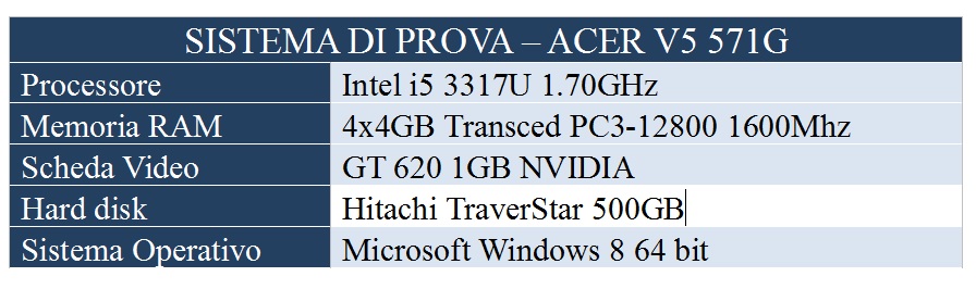 Abbiamo testato le schede di memoria su una piattaforma laptop considerato che la fotografia sportiva e giornalistica necessita spesso di tempi molto celeri nell'elaborare le immagini ed è quindi impensabile utilizzare un computer fisso. Nell'immagine che segue troverete le caratteristiche tecniche del portatile utilizzato per i test.
