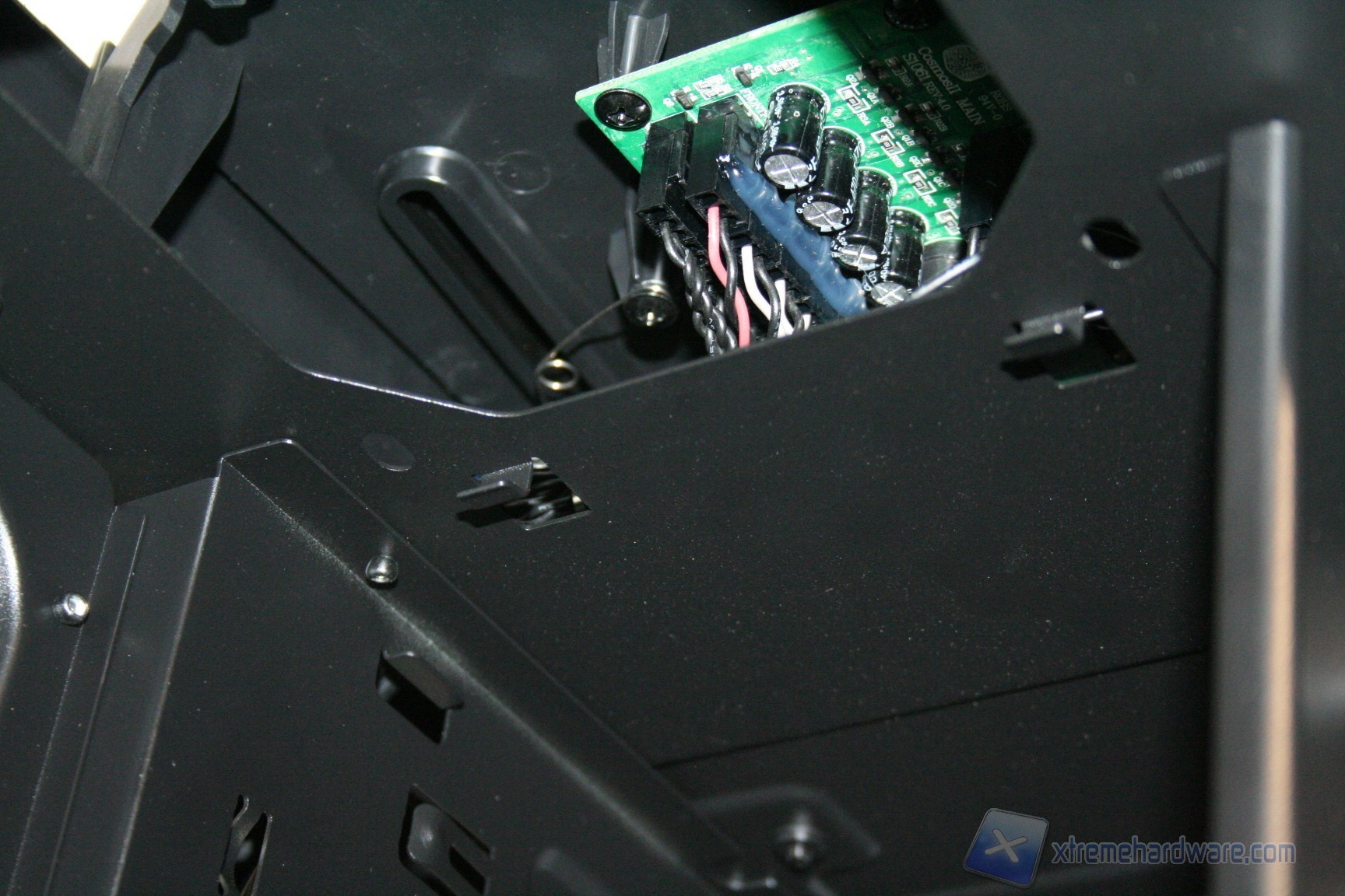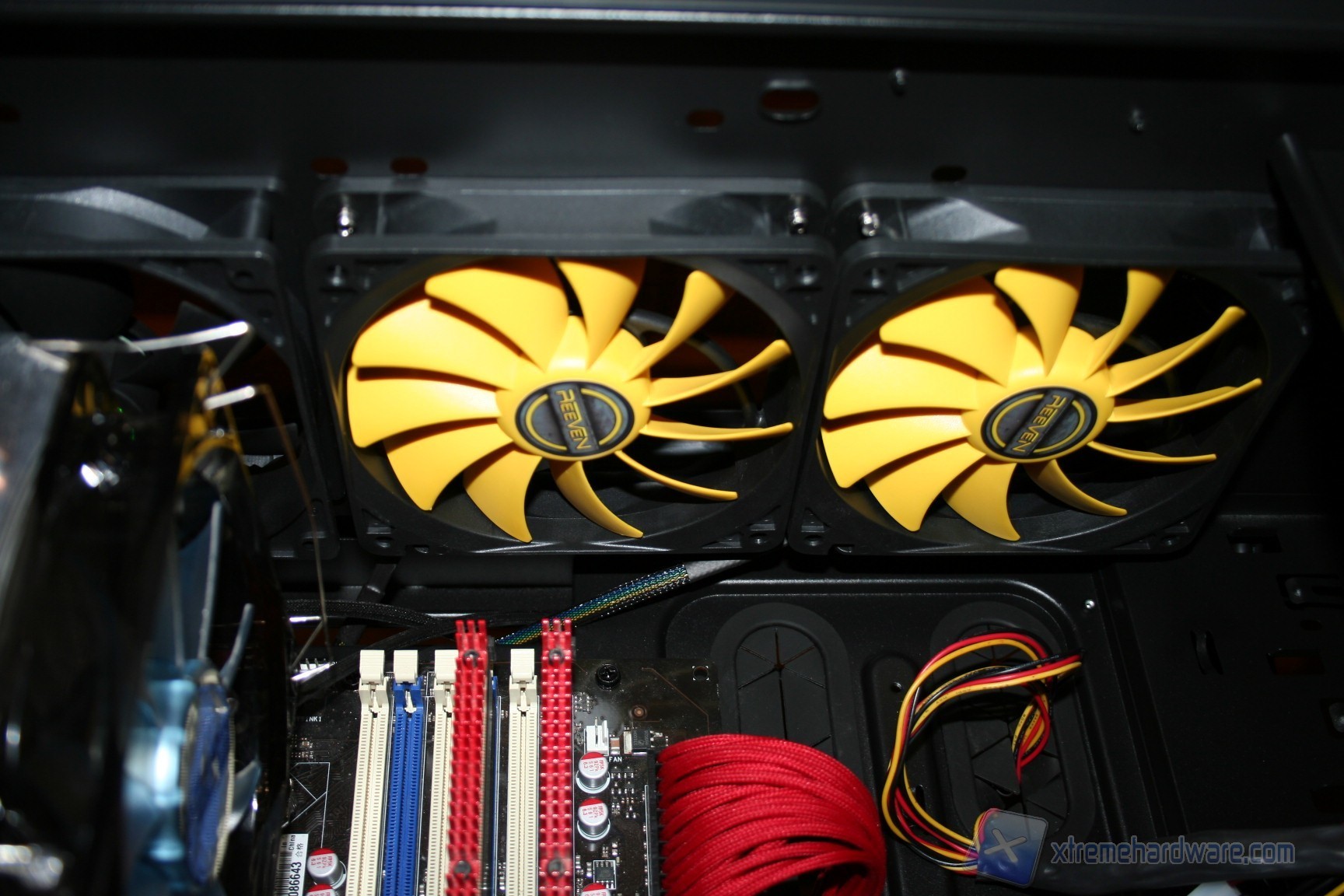 La dotazione potenziale del case è appropriata, anche se forse dato il prezzo ne avremmo gradito un numero superiore; vengono fornite in bundle due ventole da 20cm montate sia nella parte frontale (dotata di LED blu) che nella parte superiore, mentre posteriormente c’è una ventola da 140mm preinstallata in estrazione. Poi sono presenti le due ventole davanti ai cage degli hard disk inferiori, da 120mm. Oltre a queste possono essere utilizzate una ventola da 140mm anteriormente, sotto alla 200mm, poi due ventole da 120mm nella paratia laterale sinistra (consigliamo caldamente il montaggio, specialmente in configurazioni MultiGPU) ed infine tre ventole da 120mm, o due da 140mm nella parte superiore, al posto di quella da 200mm preinstallata. Il rumore è regolabile tramite il pannello di regolazione superiore, in quanto sono presenti tre regolazioni voltaggio-dipendenti con uno specifico colore. Affronteremo nel prossimo capitolo in dettaglio questa caratteristica. Per quanto riguarda i filtri antipolvere, essendo posizionati in ogni fessura di immissione, ed essendo facilmente removibili e lavabili, il quantitativo di polvere all’interno sarà molto basso.