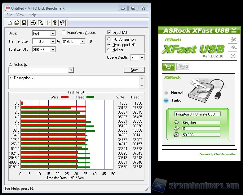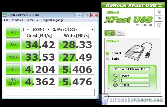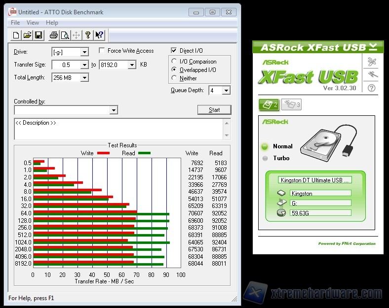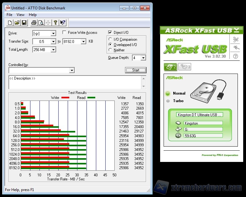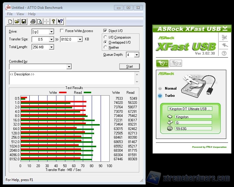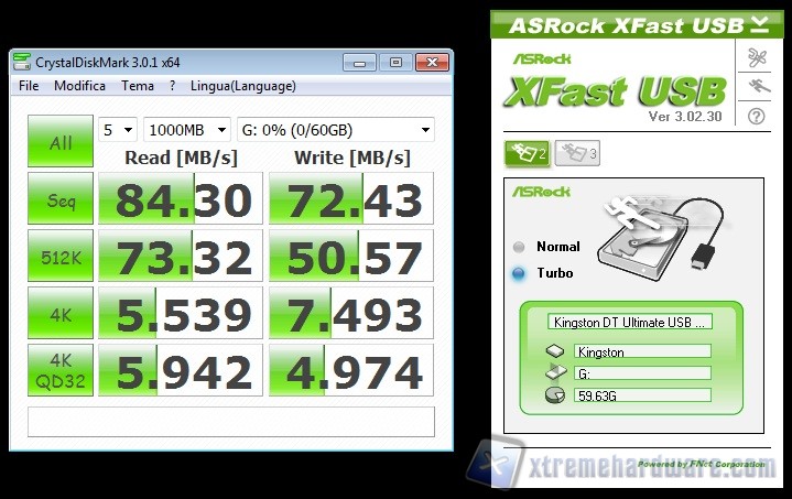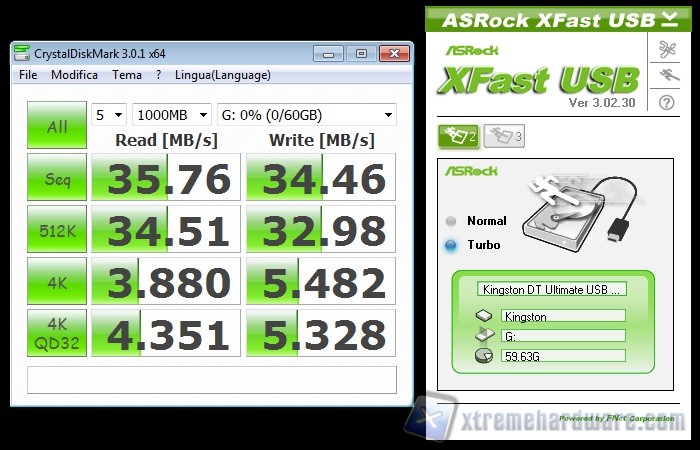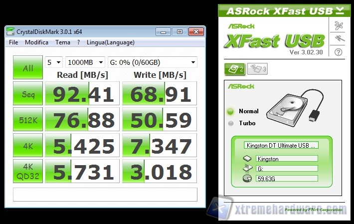 In questa sezione misuriamo le velocità di trasferimento sia sulle porte USB2.0 che le più veloci USB3.0. Per la rilevazione abbiamo scelto 2 tool ormai conosciuti e adottati come standard: ATTO e CrystalDiskMark. Come di consueto per i test abbiamo utilizzato la penna USB 3.0 Kingston DataTraveler Ultimate 64GB. La Z77 Extreme4 ha una marcia in più, si avvale infatti dell’XFast USB, un software per massimizzare i trasferimenti USB e non solo. Vediamo insieme come si comporta lato porte USB3.0: