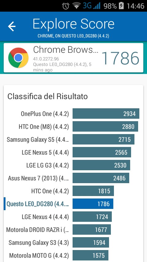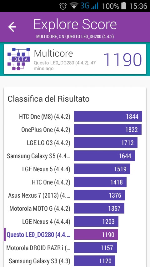 Diamo ora un giudizio complessivo sulle qualità di questo dispositivo, a partire dalle prestazioni. Di seguito trovate una serie di screenshot che ritraggono i punteggi ottenuti dal DOOGEE LEO con i più celebri benchmark per Android; come vedete i valori non sono di certo alti ma comunque molto buoni per uno smartphone di questa categoria. Nel complesso le prestazioni del DG280 sono sempre di buonissimo livello considerato il costo irrisorio di questo telefono, i benchmark non dicono tutto di un terminale e lo possiamo confermare tranquillamente dopo parecchi giorni di uso intenso e continuativo; il DOOGEE LEO è uno smartphone economico che riesce però a far girare in maniera davvero egregia Android Kitkat riducendo al minimo lag ed incertezze. Come è logico che sia non è uno smarphone adatto per videogames pesanti o applicazioni particolarmente esose però nell'utilizzo quotidiano può tranquillamente soddisfare una fetta larghissima dell'utenza.